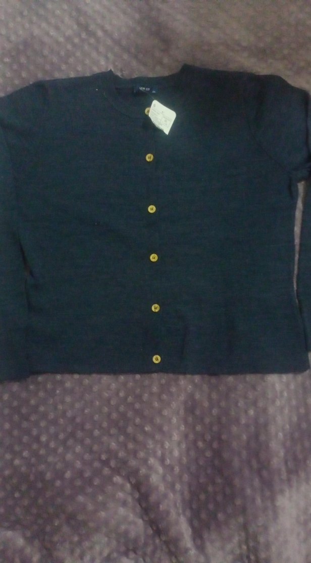 Lacivert renkte, düğmeli ön kısmı ve uzun kollu, yuvarlak yakalı yün kazak. Rahat kesimli ve normal boyda, günlük kullanıma uygun.
