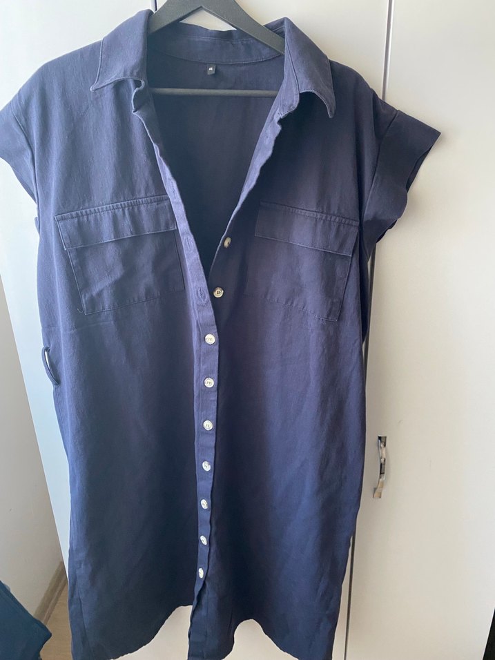 düğmeli, lacivert keten kuşaklı elbise. %100 pamuklu elbisw