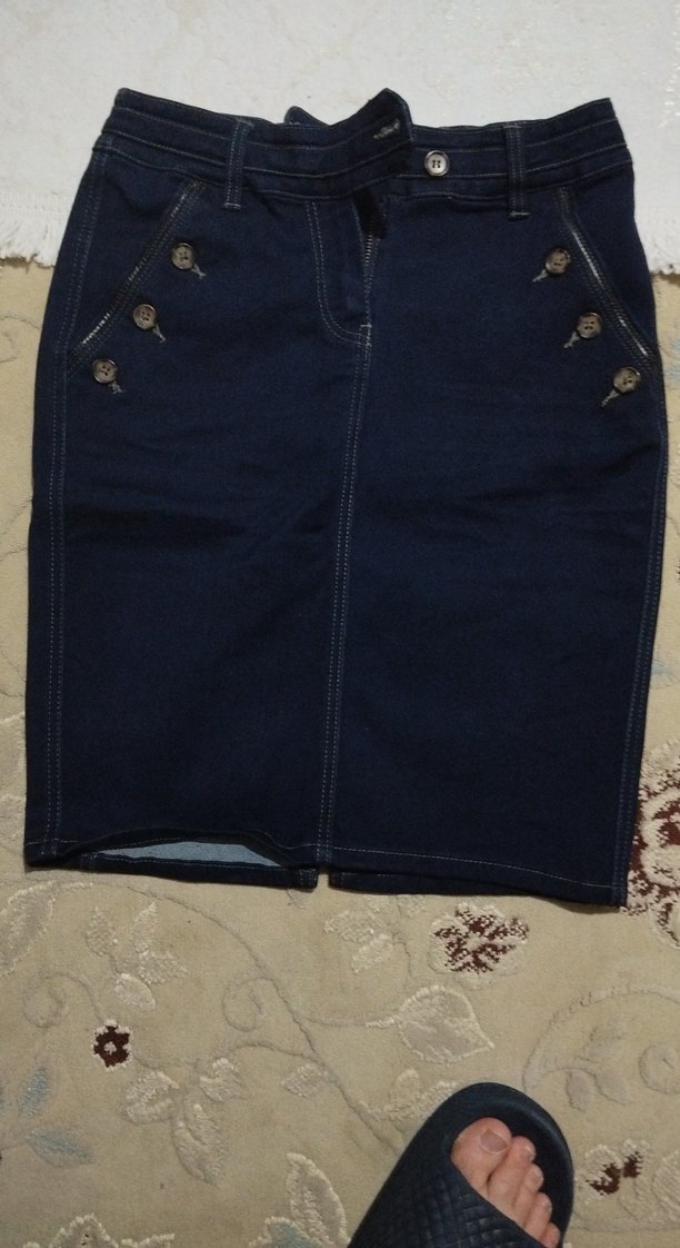 Düğmeli, lacivert kot kumaştan yapılmış, kısa ve vücuda oturan etek. Günlük kullanıma uygun, rahat ve şık bir parça.