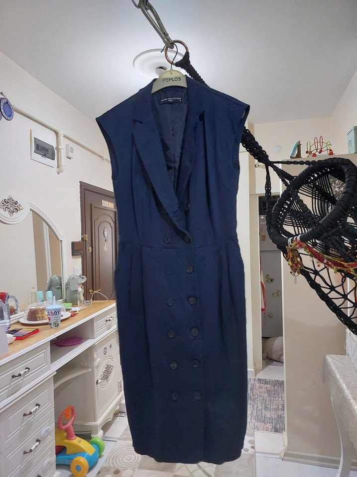 Lacivert renkli, kolsuz, yakalı ve düğmeli uzun elbise. Ofis ve iş ortamları için klasik ve şık tasarım sunar.