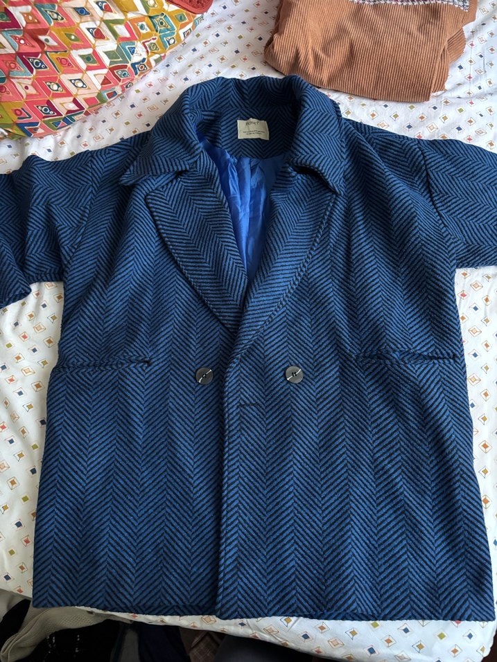 Pamuk kumaştan, düğmeli ve notched yakalı, bol kesim lacivert hamile kaban. Uzun kollu ve midi boyda, günlük kullanıma uygun.