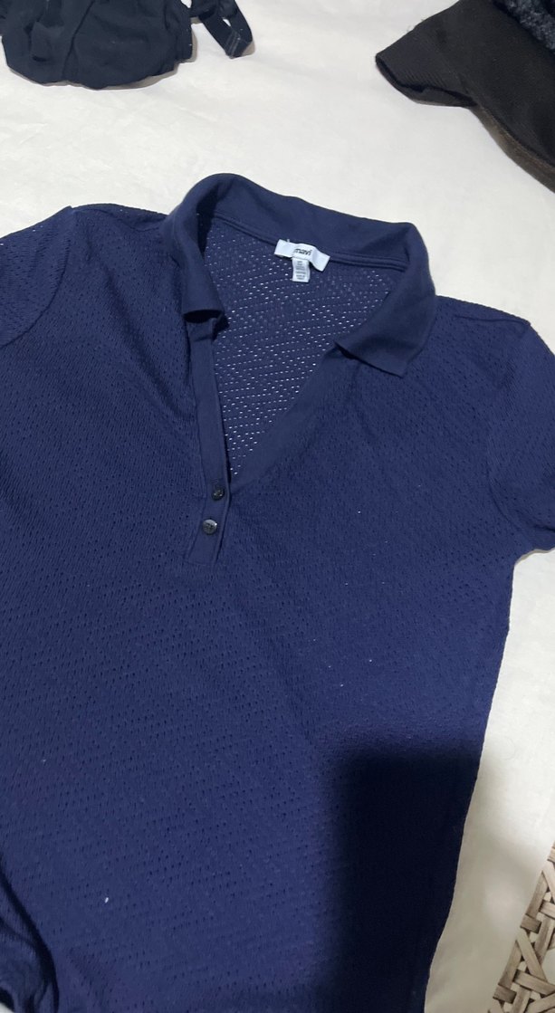 Lacivert renk, düğmeli, kısa kollu, pamuklu kumaştan yapılmış, yakalı ve vücuda oturan tişört bir kere giyildi