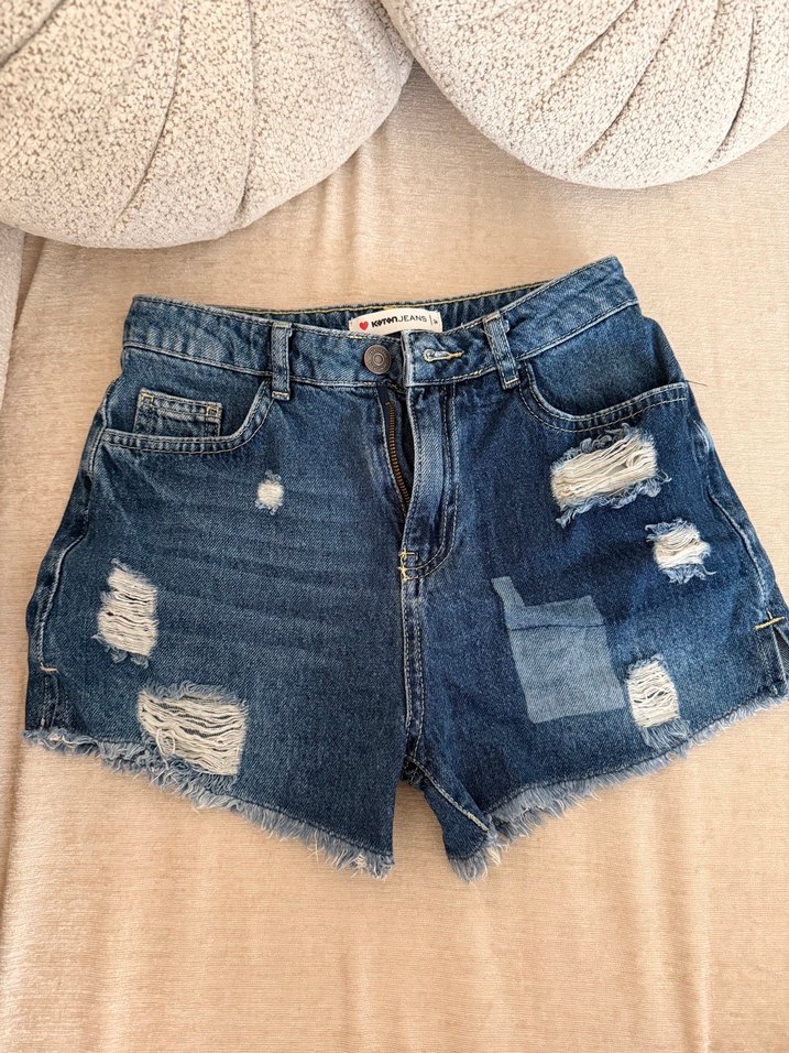 Salaş kesim, düğmeli lacivert kot mini şort. Yıpranmış dokunuşlarıyla trend sokak stili sunar. Günlük kullanıma uygundur.