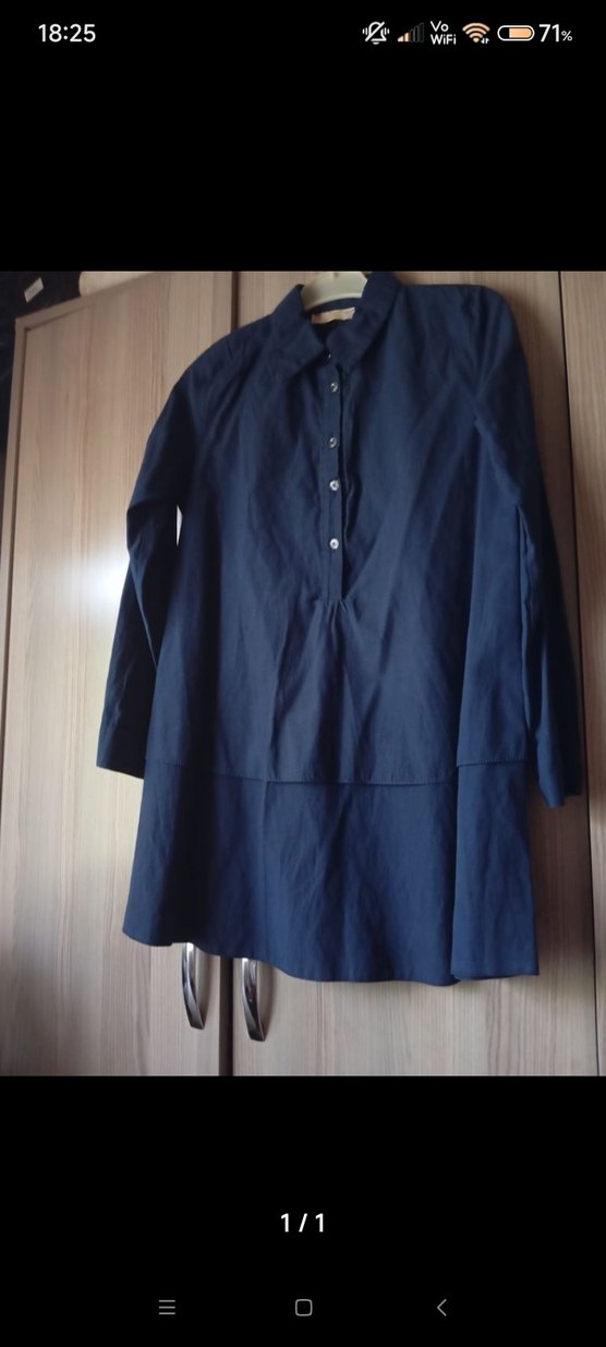 Lacivert renkli, keten kumaştan yapılmış, yakalı ve uzun kollu tunik. Düğmeli önü ve bol kesimiyle günlük kullanım için uygundur.