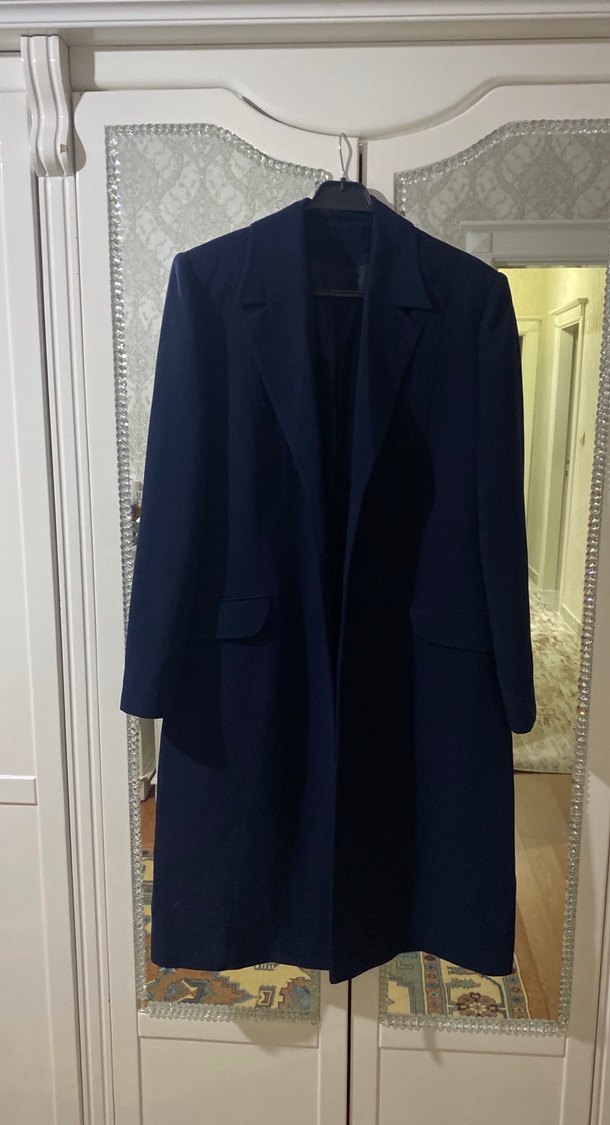 Lacivert renkte, düğmeli, uzun kollu ve klasik yakalı kadın ceket Yumuşak ve sıcak dokusu ile iş ortamına uygundur.