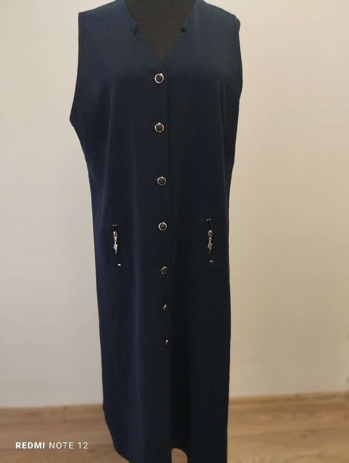 Boy omuzdan 120 cm. İki kol arası 54 cm Lacivert renkli, düğmeli, kolsuz uzun elbise. Viskon kumaştan üretilmiştir. Günlük ve iş stiline uygundur. ️Sayılı kullanıldı