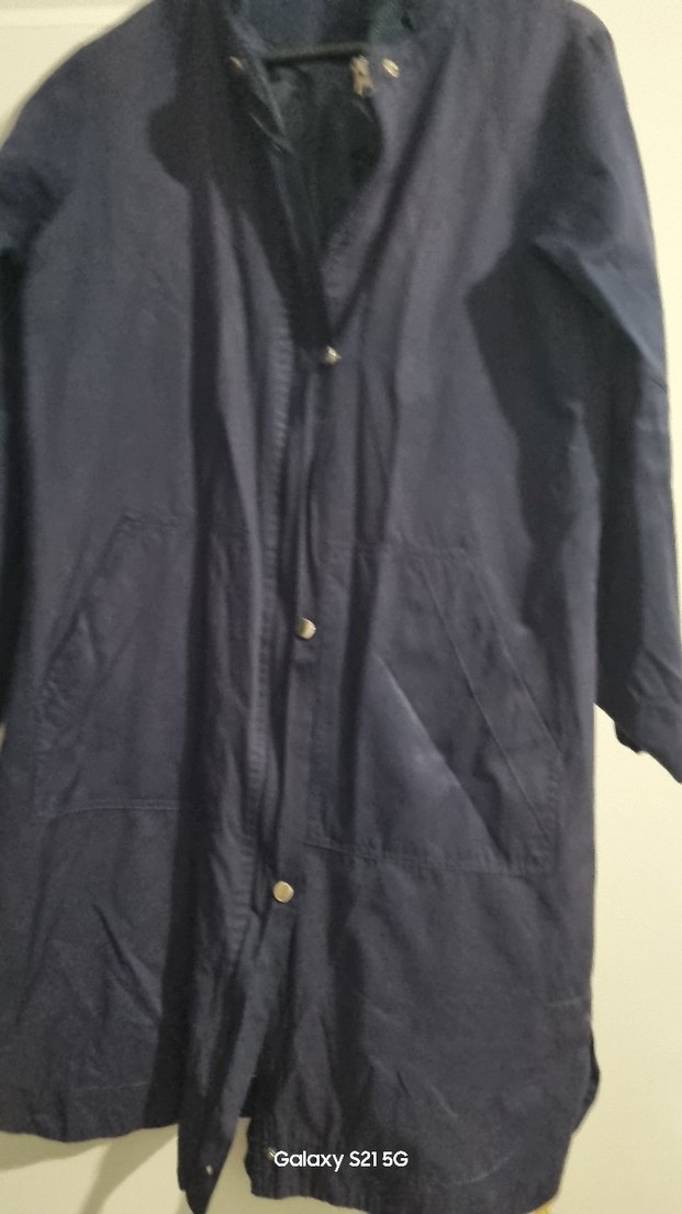 Lacivert renkte, keten kumaştan yapılmış uzun ve düğmeli kadın ceketi. Salaş kesimi, uzun kollu ve klasik yaka detayıyla gündelik kullanıma uygundur.