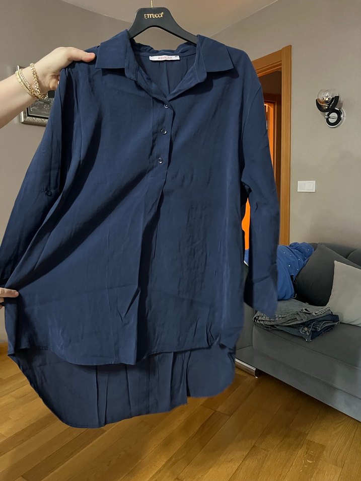 Std 36/46 uyumlu Lacivert renk, düğmeli ön, uzun kollu, bol kesim midi uzunlukta kadın gömleği. Tensel kumaştan, günlük rahat sokak stili için uygundur.