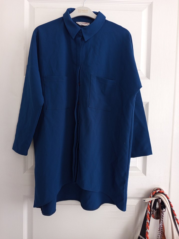 Lacivert renk, keten kumaştan, düğmeli ve cep detaylı, uzun kollu, yakalı, bol kesim gömlek. Rahat ve günlük kullanım için uygundur.