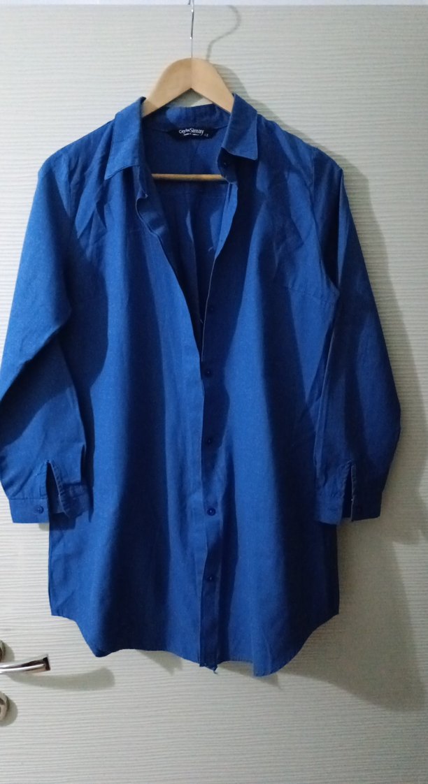 Lacivert keten kumaştan, düğmeli önü ve çentikli yaka detaylı. Uzun kollu, midi boy ve bol kesimli, sade günlük kullanıma uygun gömlek.