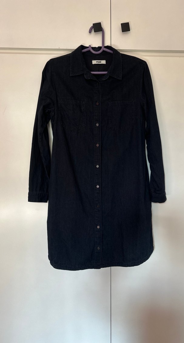Lacivert ince kot kumaştan, düğmeli, uzun kollu, midi uzunlukta ve hafif bol kesim olan bu gömlek elbise, minimal ve rahat bir stil sunar. Cepleri vardır.1 kez giydim kusursuzdur.