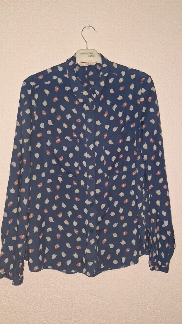 Lacivert renkte, düğmeli ve yakalı, uzun kollu salaş kesim gömlek. Sentetik kumaştan üretilmiş, koyu renkli baykuş desenlidir ve günlük sokak stiline uygundur.
