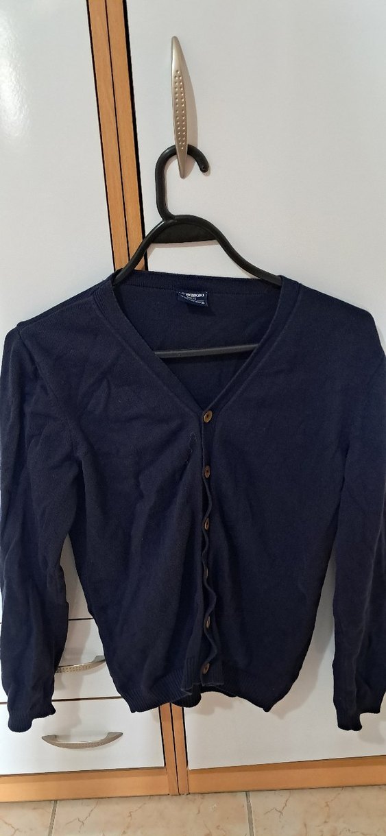 Lacivert, pamuk kumaştan, düğmeli V yaka ve uzun kollu, normal boyda, vücuda oturan erkek cocuk hırkası.