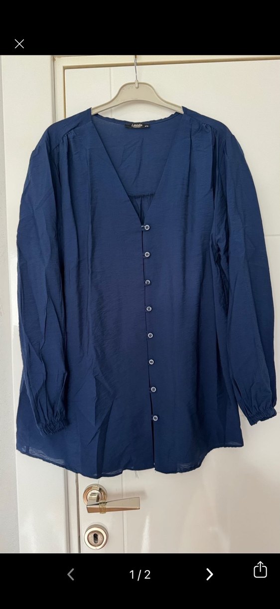 Lacivert keten kumaştan uzun kollu, V yaka, düğmeli ve normal midi uzunlukta kadın gömleği. Minimalist ve sade tasarımıyla günlük kullanım için uygundur.