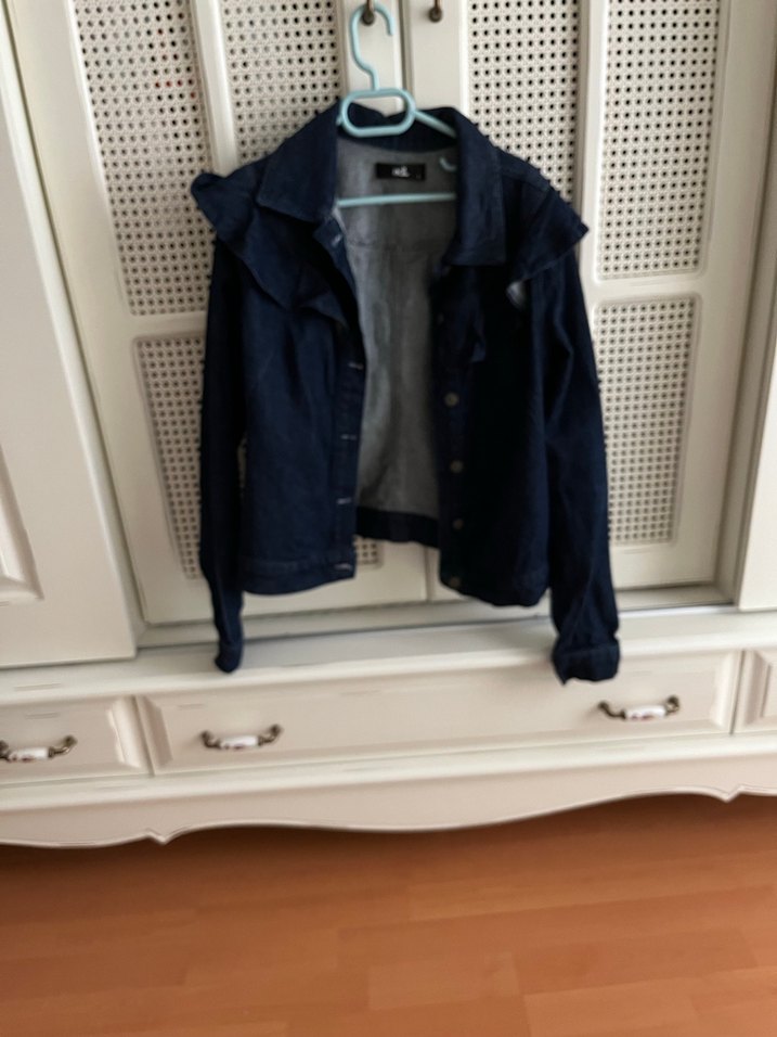 Lacivert renkte, düğmeli ve yakası volanlı, uzun kollu, normal midi boyda, fitted kesim kadın denim ceketi.