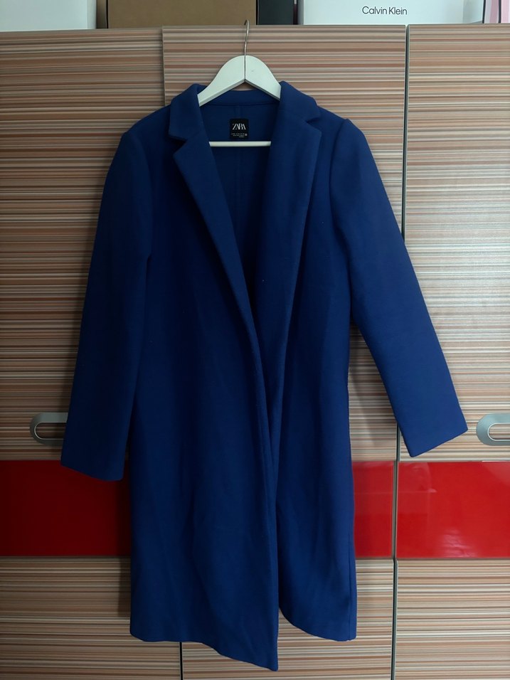 Lacivert renkte, düz kesim ve klasik yaka detaylı uzun kollu kaban.