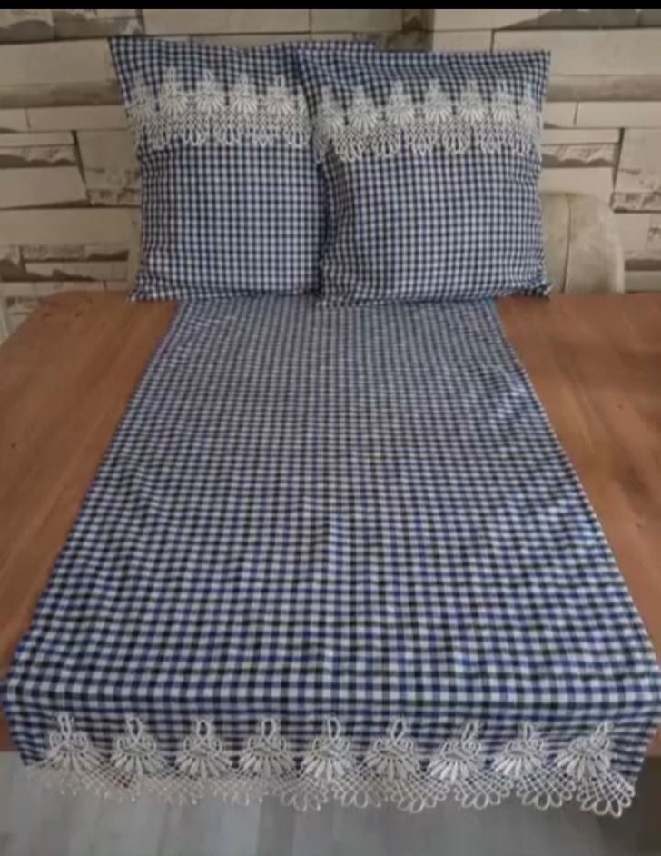 Lacivert ekose desenli, dantel detaylı runner ve uyumlu iki adet kırlent kılıfları.