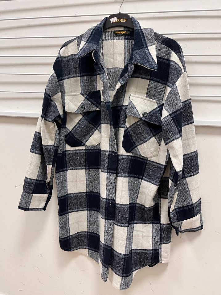 Lacivert ekose desenli, düğmeli, uzun kollu, rahat kesim kadın gömleği. Yumuşak ve sıcak kumaştan, günlük sokak stiline uygun. tesettür giyime de normal giyim içinde uygundur