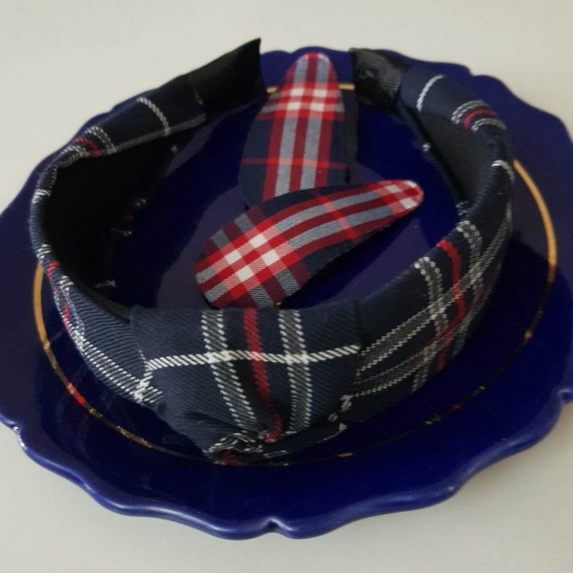 elastan lacivert ekose kumaş kaplı esnek saç bantı ve uyumlu 2 adet çıtçıt toka. kolejli tasarım. okula, işe, çay saatine, her kombine uyumlu. saç bantı duran ölçüler 13x16 cm, tokalar 8 cm.