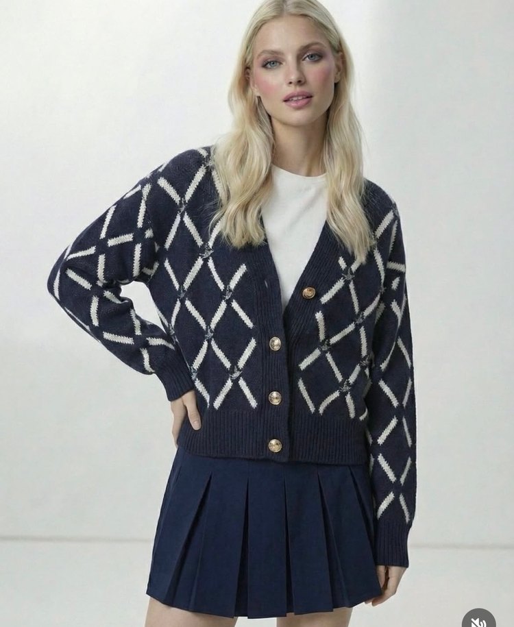 Lacivert ekoseli, düğmeli triko kadın hırka, uzun kollu ve geniş kesim. Notlu yaka detayıyla günlük kullanıma uygun rahat bir parça.