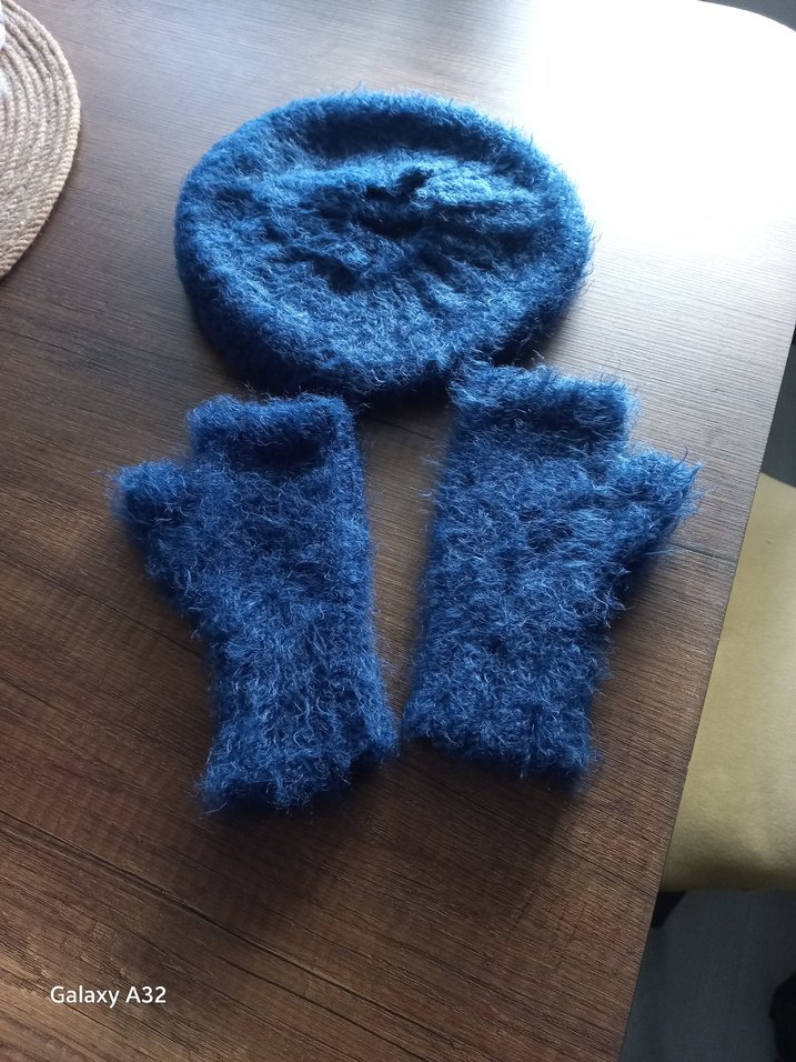 Koyu mavi, yumuşak, el örgü , nako paris ipten yapılmış kadın örgü bere ve tek parmak eldiveni. Rahat ve modaya uygun, trend belirleyiciler için ideal.
