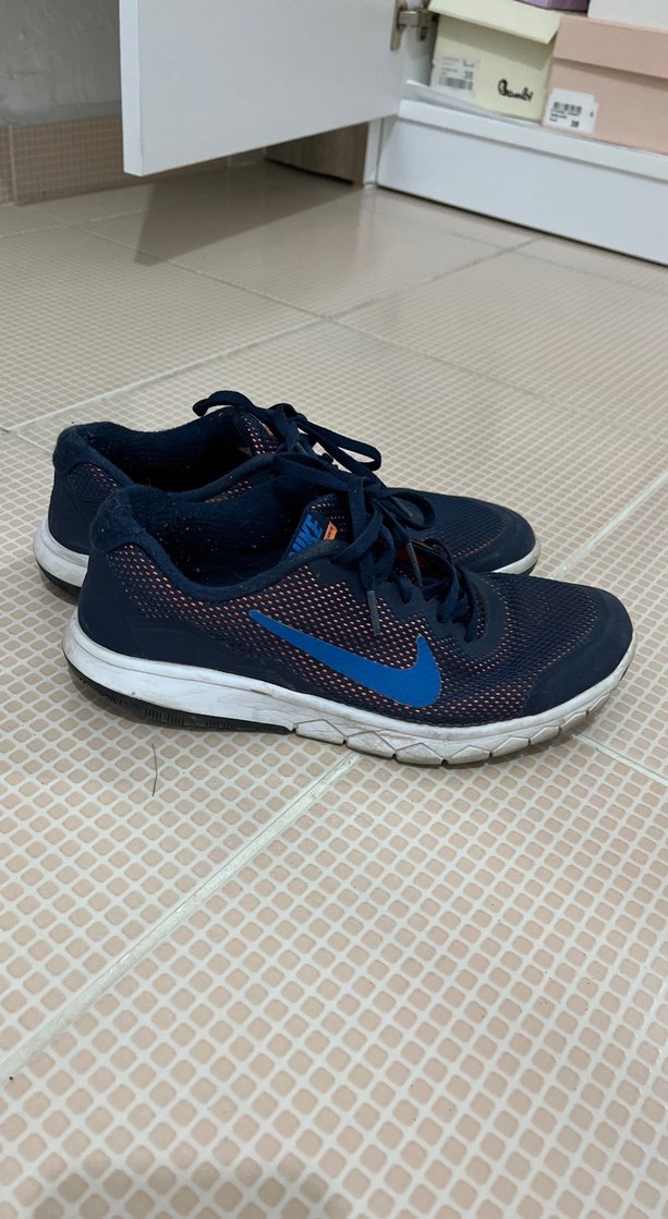 Elastik bağcıklı, kauçuk tabanlı koyu mavi spor ayakkabılar. Bağlamalı, batik desenli ve sokak modası tarzında. Spor için uygundur.