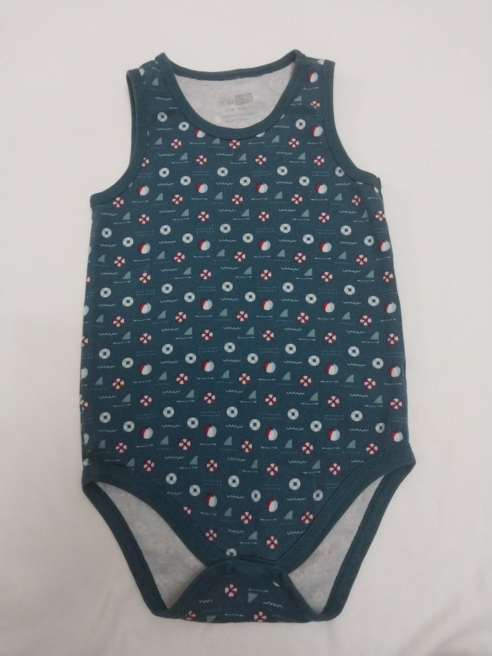 Lacivert, kolsuz erkek bebek body. Yuvarlak yaka, sentetik kumaştan örme, küçük desenli ve normcore tarzında.