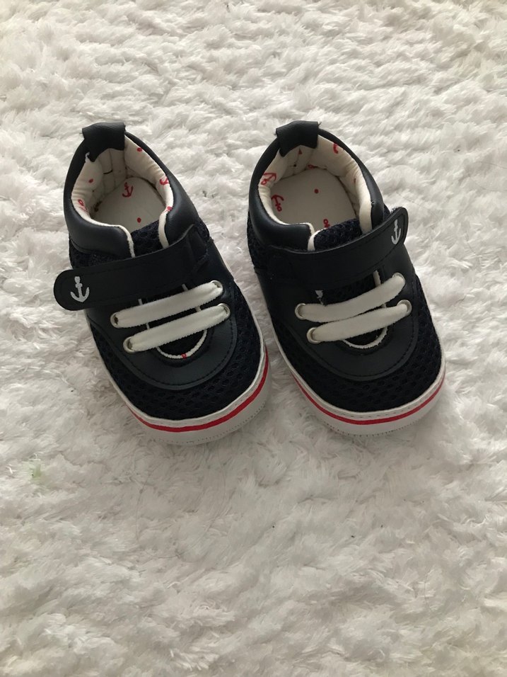 Lacivert renkli, nakış detaylı erkek bebek ilk adım ayakkabısı. Kolay kullanım için cırt cırtlıdır, rahat kauçuk tabanlıdır.