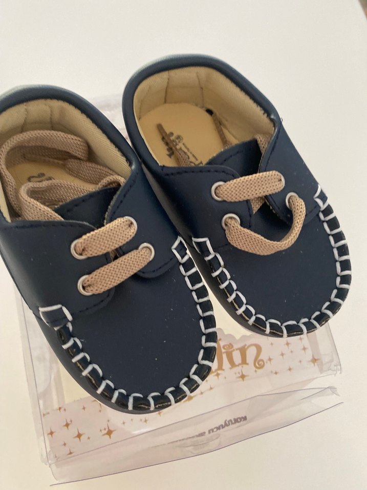 Lacivert renkte, kauçuk malzemeden yapılmış, tokalı ve nakış detaylı erkek bebek ilk adım ayakkabısı. Sade ve normcore stilde.