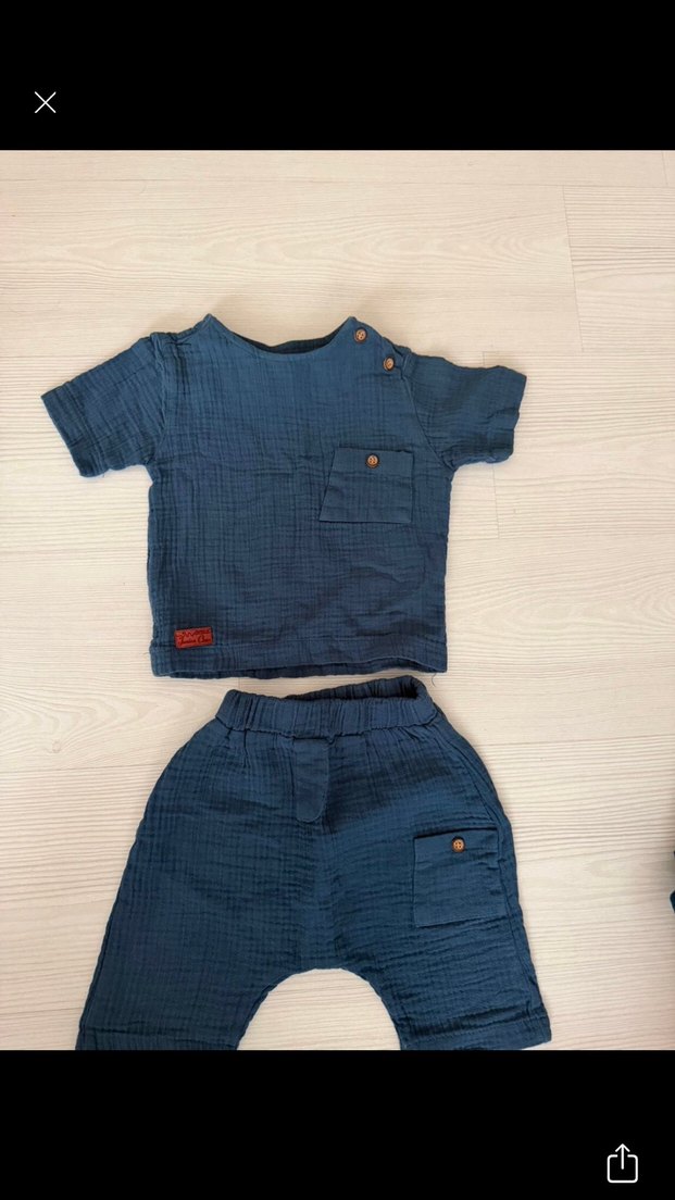 Lacivert keten kumaştan, kısa kollu, düğme detaylı ve bisiklet yakalı erkek bebek takımı. Yan cepli pantolonla kombinlenmiştir.