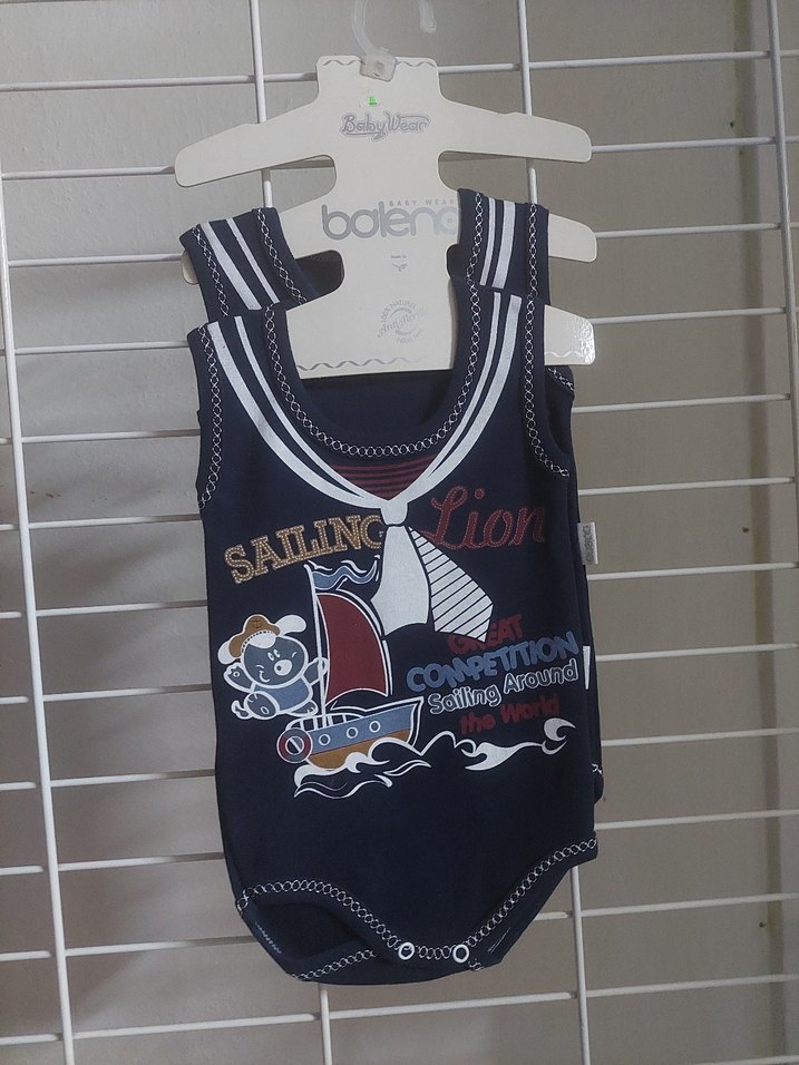 Pamuklu kumaştan, kolsuz lacivert erkek bebek body. Velcro kapamalı, yelkenli temalı baskılı ve yuvarlak yakalı. ⚓56-1Months 62-3 Months.
