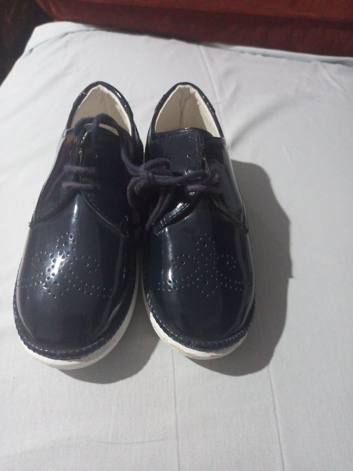 Lacivert renkli, bağcıklı ve lastik malzemeden yapılmış klasik tarzda erkek çocuk özel gün ayakkabısı. Desensiz ve sade görünüme sahip.