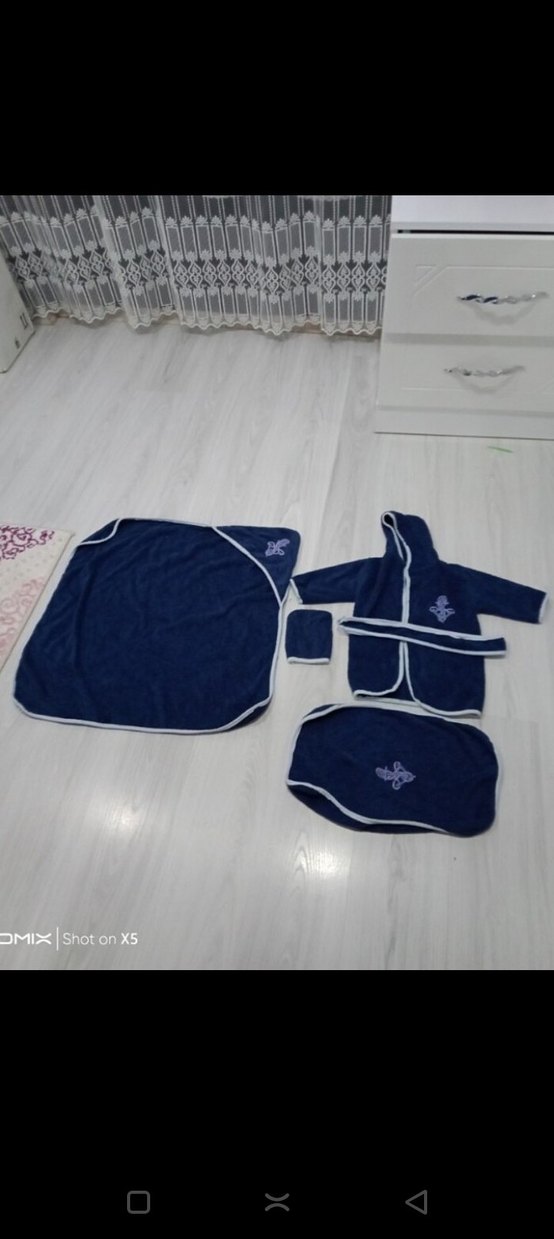 Erkek çocuklar için kapüşonlu bornoz, havlu ve el bezi içeren lacivert renkli, baskılı desenli set. Beyaz kenarlıklıdır.