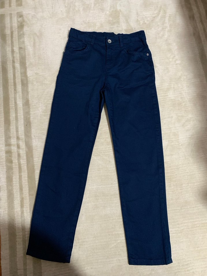 Lacivert renkli, düz desenli erkek çocuk denim pantolon, rahat kesimiyle günlük kullanıma uygun şık bir seçenek sunar.