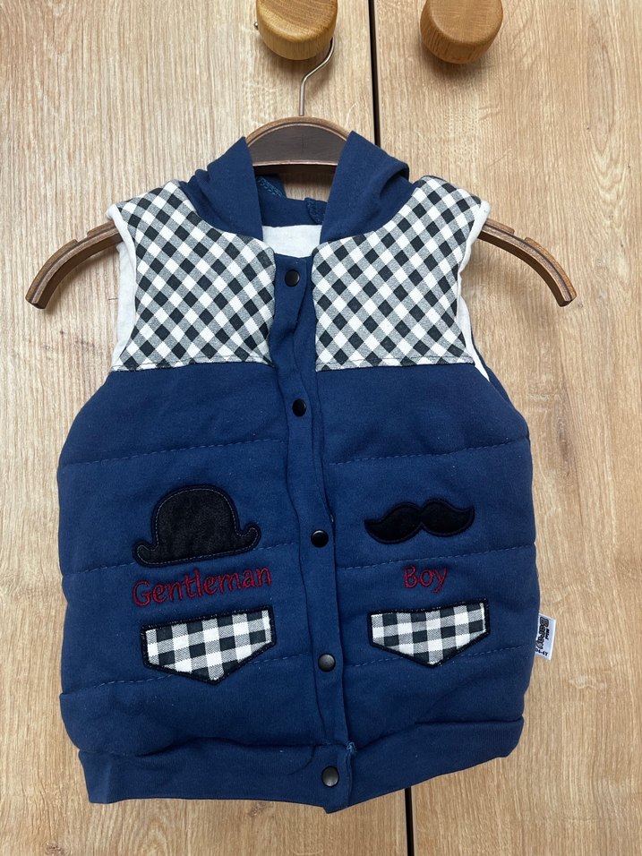 Lacivert renkli, düğmeli ve yakalı erkek çocuk yeleği. Omuz ve ceplerinde ekose desen ve işleme var. "Gentleman Boy" yazıları işlemeli.