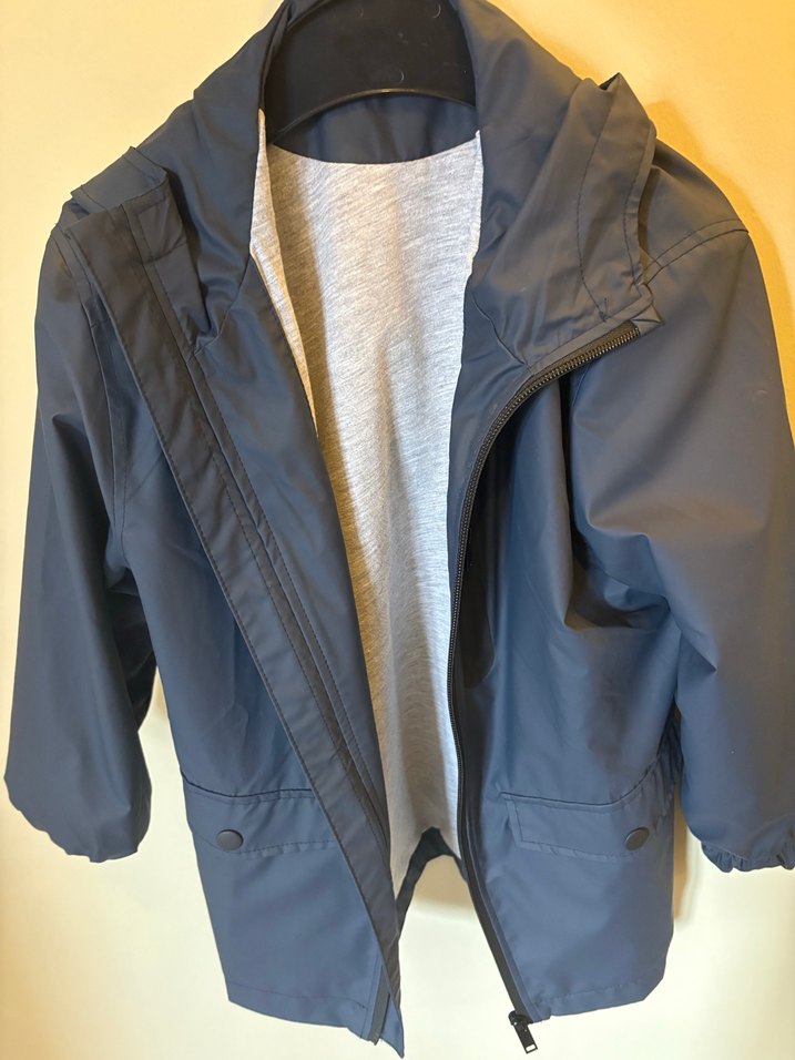 Lacivert renk içi gri penye kumaş, fermuarlı ve notalı yaka detaylı erkek çocuk yağmurluğu. Rahat kesimli, yumuşak ve sıcak kumaştan üretilmiştir. ️