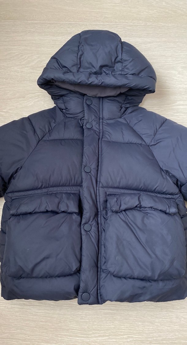 Lacivert renkli, düğmeli ve kapüşonlu erkek çocuk montu. Yumuşak ve sıcak kumaştan, iki ön cepli, sade ve desen içermeyen tasarıma sahip.