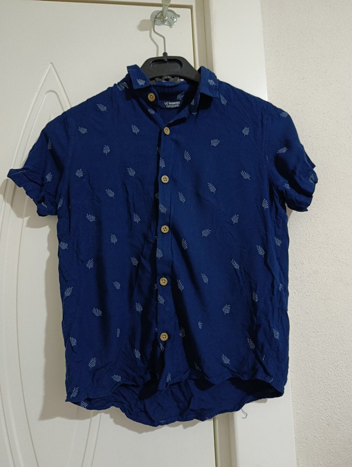 Lacivert renkli, keten kumaştan erkek çocuk gömleği. Kısa kollu, yakalı ve düğmeli, rahat kesimli, sokak stiline uygun.