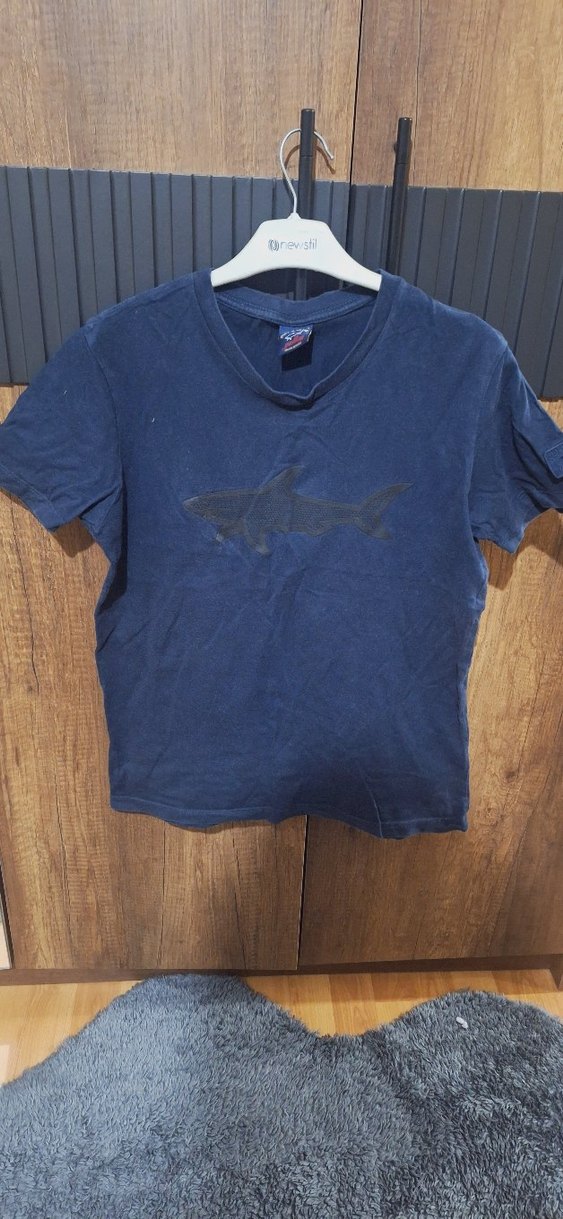 Lacivert renkli, kısa kollu ve bisiklet yaka erkek çocuk tişörtü. Denim kumaştan, baskılı köpekbalığı deseniyle sade ve şık bir görünüm sunar.