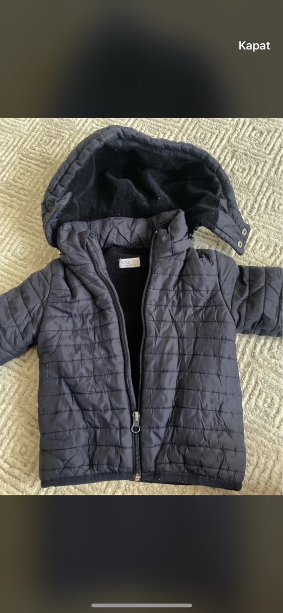 Lacivert renkli, erkek çocuklar için kürklü kapüşonlu ve yakalı, yumuşak ve sıcak kumaştan üretilmiş, sade sokak stili mont.
