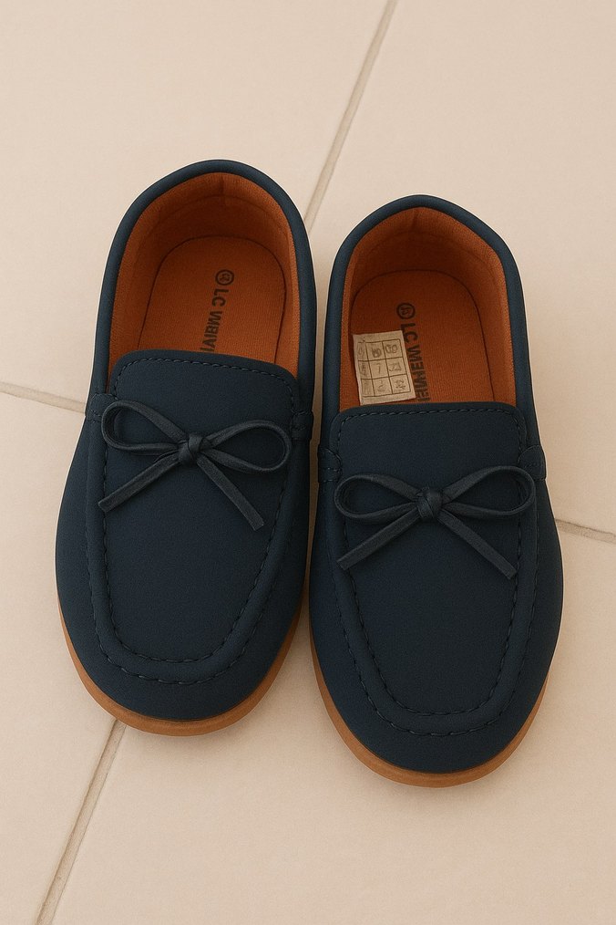 Lacivert renkte, lastik tabanlı, fiyonk detaylı erkek çocuk özel gün ayakkabısı, sade ve normcore tarzda. Defosu yok, hiç giyilmedi
