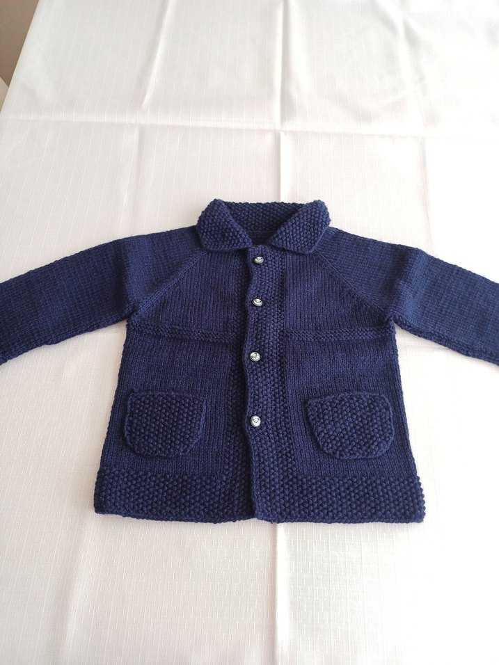 Lacivert renkte, notched lapel yakalı, uzun kollu ve cepli örme erkek çocuk triko hırka. Rahat kesimli ve sade tarzda bir modeldir. El emeğidir. Görsel üzerinden sipariş alınır. Bedeni 1 ve 2 yaş