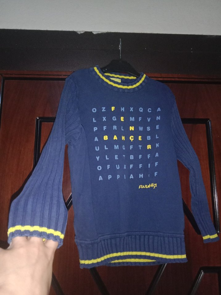 Lacivert, uzun kollu, bisiklet yaka, triko kumaştan yapılmış erkek çocuk sweatshirt. Sarı detaylı baskılı deseniyle trend sokak tarzına uygun.