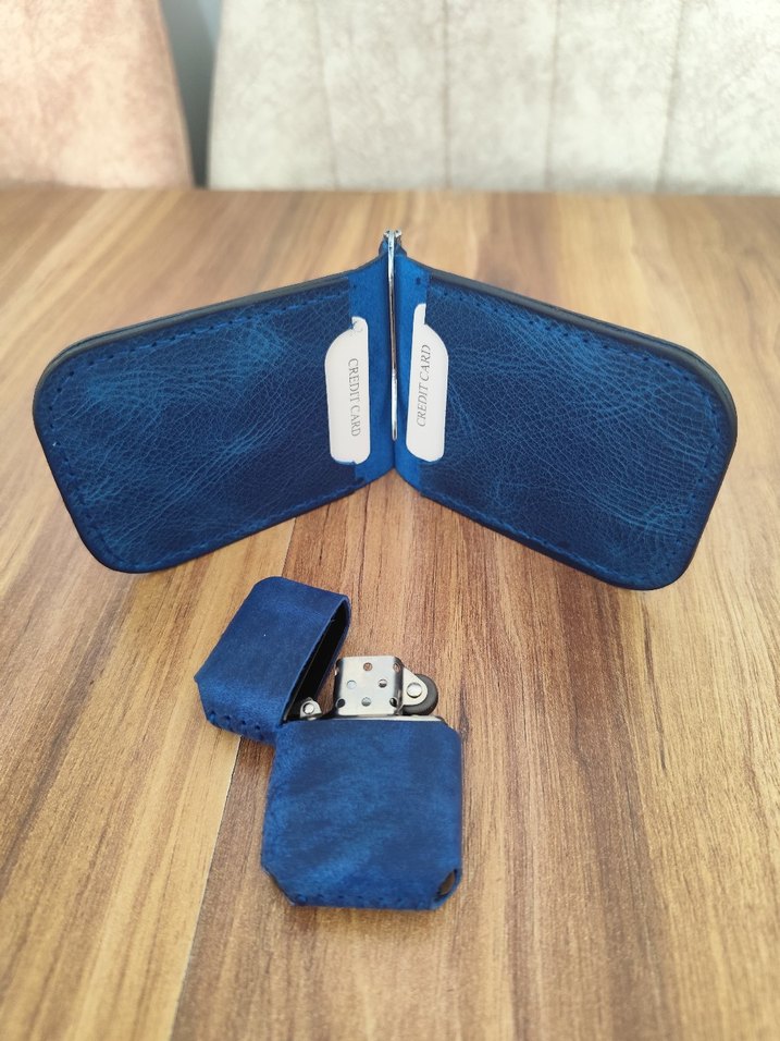 Lacivert renkli, sade tasarımlı erkek cüzdanı ve uyumlu çakmak kılıfı içeren minimalist stil set. %100 gerçek deri