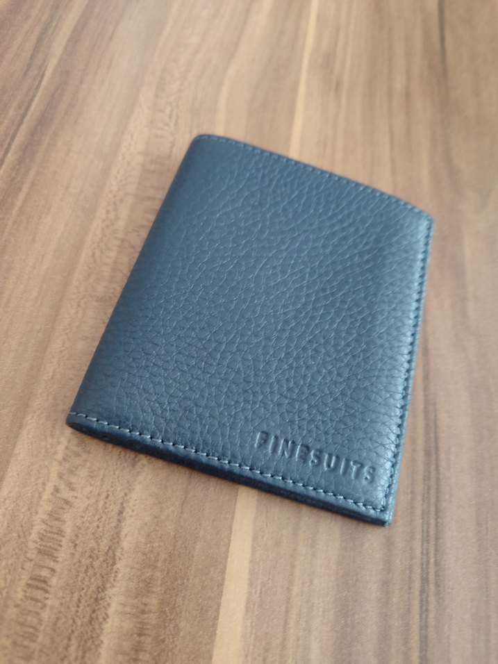 Lacivert renkte, desen içermeyen, çağdaş tarzda erkek cüzdanı. Dokulu yüzeye sahip ve Finesuits markası kabartmalı.