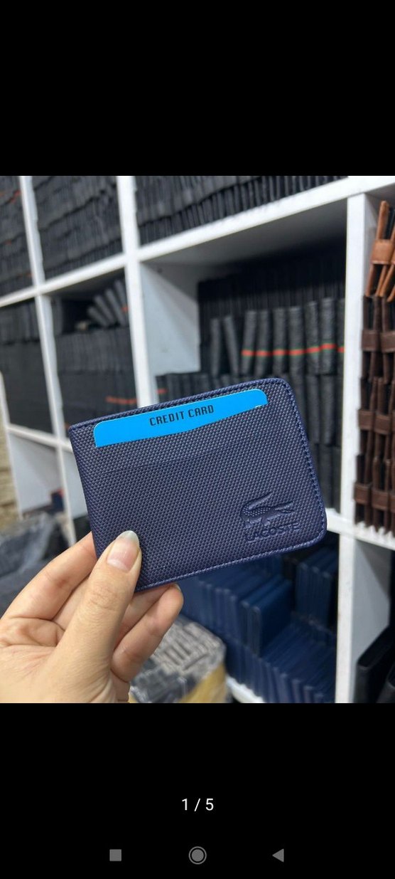 Lacivert renkli, baskılı dokulu erkek cüzdanı. Önünde 'CREDIT CARD' yazılı bir kart yuvası ve Lacoste logosu bulunur. İş ve sokak stilini birleştirir.