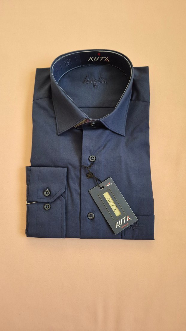 Lacivert renkte, uzun kollu, düğmeli ve notched lapel yakalı erkek gömleği. Marka: KUTA.