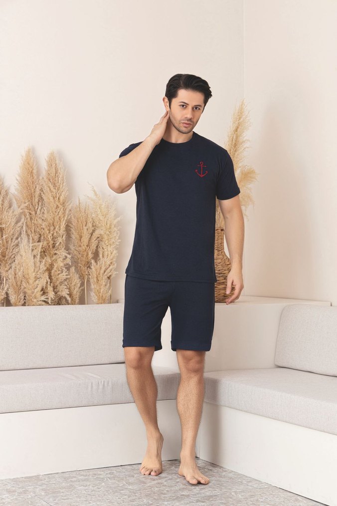 Lacivert, kısa kollu ve şortlu, bisiklet yaka ve bol kesimli pijama takımı. Minimal çapa detayıyla rahat ve şık görünüme sahip. ️