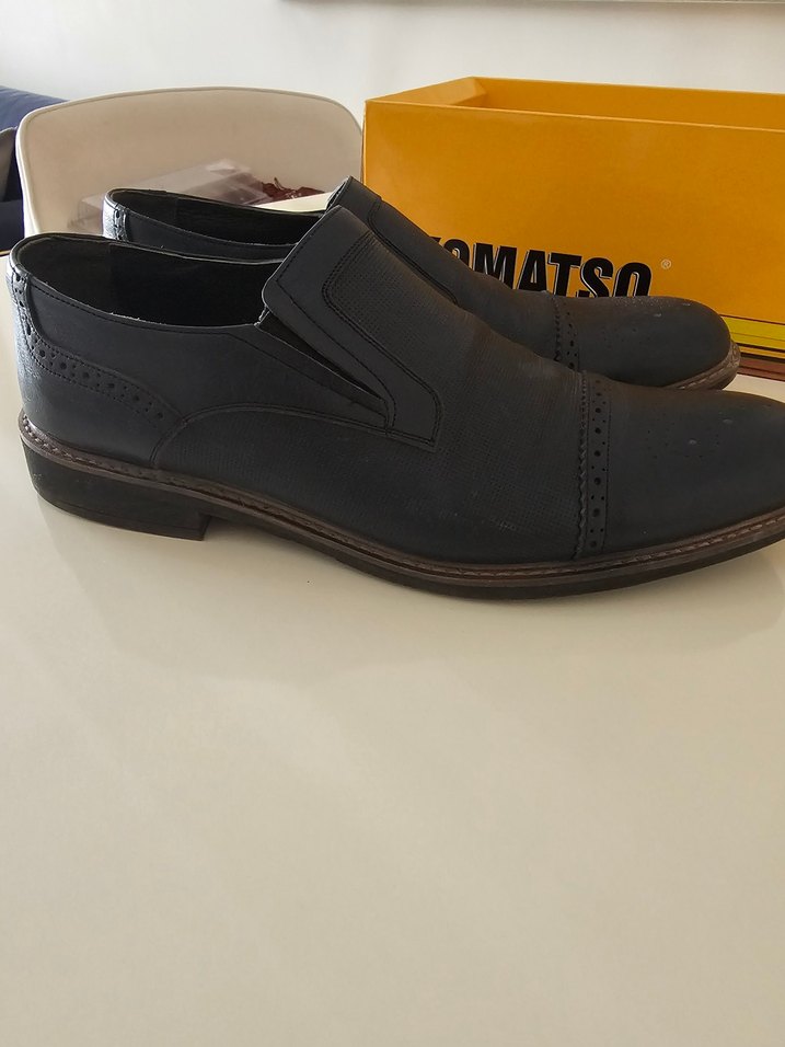 Lacivert renkli, tokalı erkek klasik ofis ayakkabısı. Kauçuk tabanlı ve düz desensiz, trendi günlük iş stiline uygundur. KOM markası.