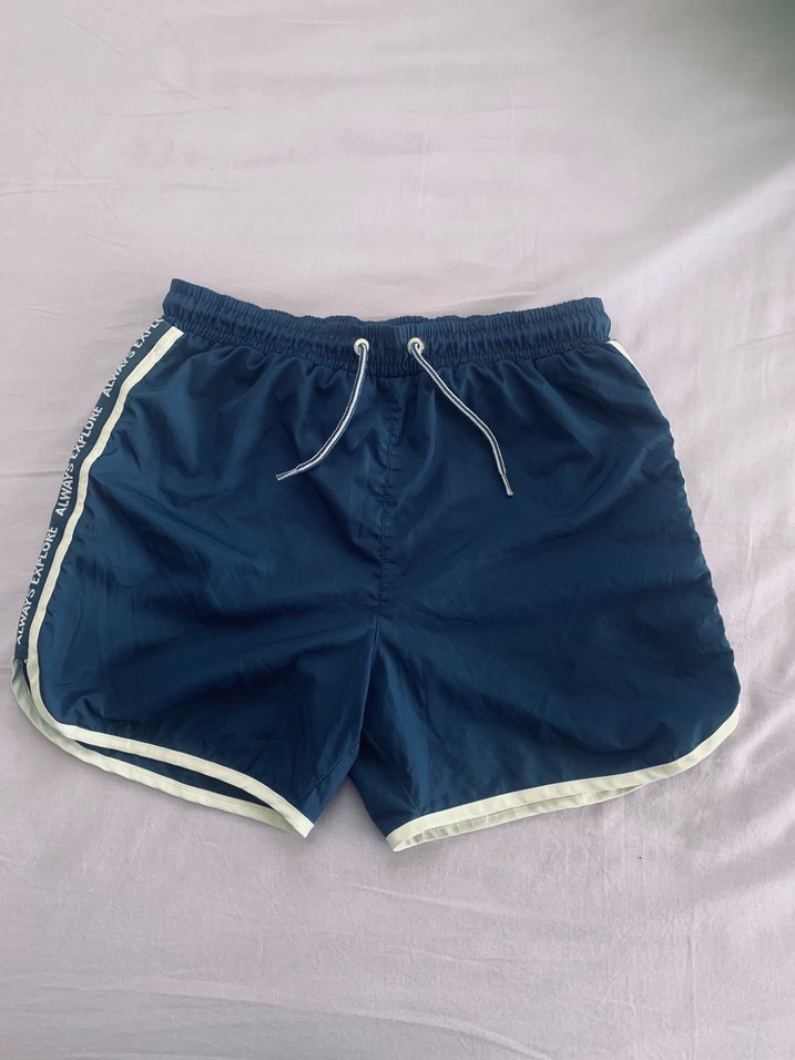 Lacivert mini erkek şort, beyaz yan şeritler ve bağcıklı elastik bel ile rahat ve salaş bir kesime sahip. Plaj için uygun.
